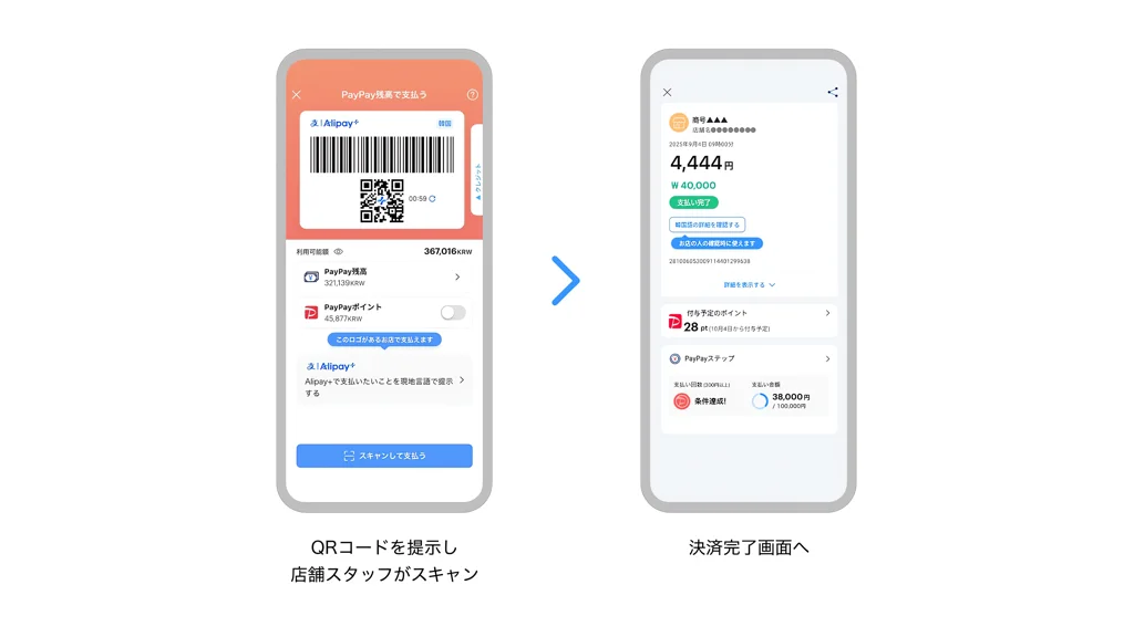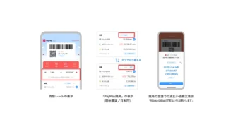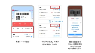 本モードでは、バーコード/QRコードのストアスキャン方式(CPM)とユーザースキャン方式(MPM)の両方に対応する。支払い手段は国内同様に「PayPay残高払い」(赤画面)と「PayPayクレジット」(青画面)を利用できる。決済時には現地通貨と日本円の金額が即時表示され、為替レートは海外ネットワーク事業者または海外アクワイアラーが提示するレートに、税込3.85%の海外事務手数料を加えたものが適用される。