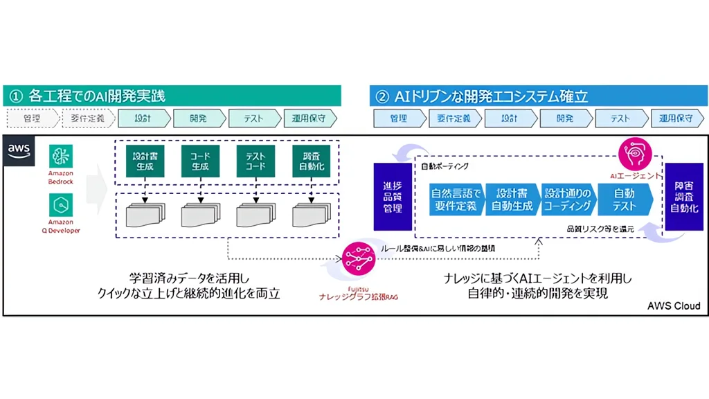 取組の初期段階では、開発・テスト領域で富士通の独自技術「ナレッジグラフ拡張RAG」を活用する。大規模データの関係性をナレッジグラフで紐づけ、生成AIへの入力データを高度化することで、反復適用により知見を蓄積し、生成AIの精度向上を図る。
