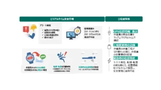 作業員向けの「MAMORINU」では、生体データから熱中症リスクの高まりや集中力低下、継続的な高負荷作業の兆候を検知してアラートを発信する。転倒・転落の検知や、作業員自身によるSOS発信機能により、管理者の迅速な緊急対応を支援する。加えて、工程ごとの作業時間や作業負荷の可視化・分析により、現場実態に基づく労働環境の整備や業務改善を後押しする。