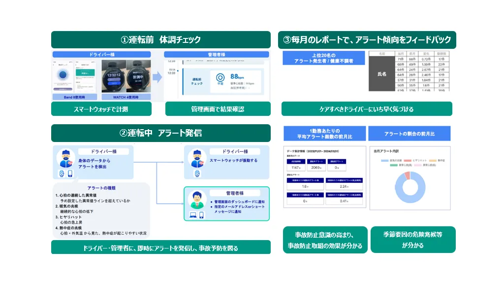 三井住友海上が提供する「補償前後のソリューション」に、enstemの専用スマートウォッチを活用した2つのサービスを追加し、全国の保険代理店を通じて提供する。ドライバー向けの「Nobi for Driver」では、生体データから無自覚の体調変化や眠気などの危険兆候を検知し、振動やメッセージでドライバーと管理者へアラートを送る。位置情報などを組み合わせ、ルート上の危険箇所の可視化や運転状況のリアルタイム確認も可能だ。さらに、アラート発生傾向をenstemの専任スタッフが管理者へフィードバックし、体調を気遣う声掛けや季節要因を踏まえた注意喚起を促す。