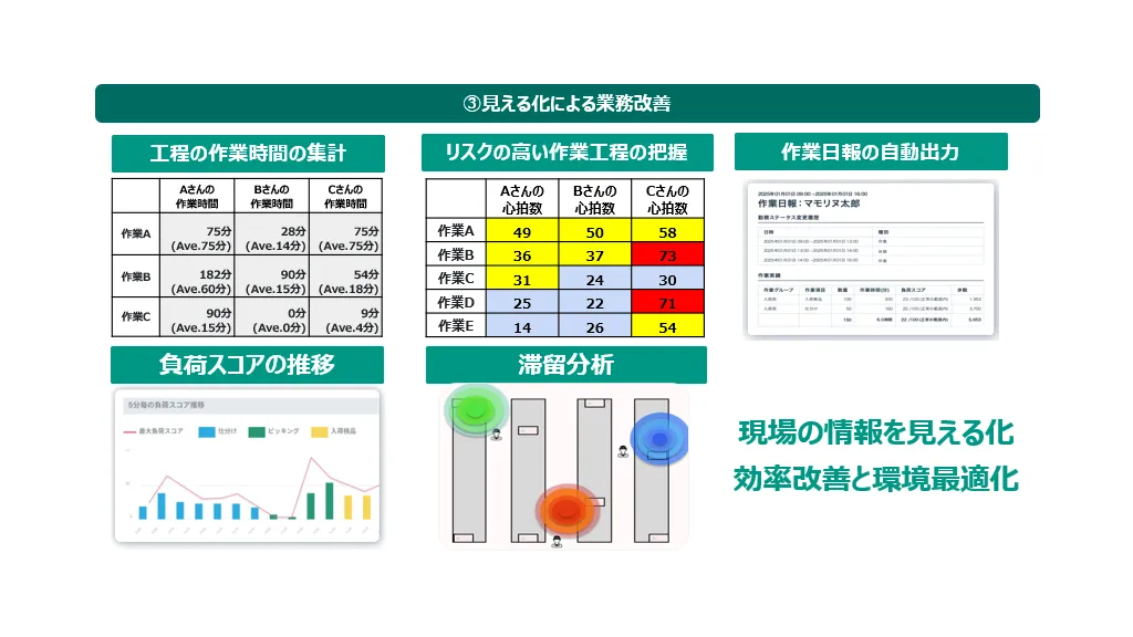 作業員向けの「MAMORINU」では、生体データから熱中症リスクの高まりや集中力低下、継続的な高負荷作業の兆候を検知してアラートを発信する。転倒・転落の検知や、作業員自身によるSOS発信機能により、管理者の迅速な緊急対応を支援する。加えて、工程ごとの作業時間や作業負荷の可視化・分析により、現場実態に基づく労働環境の整備や業務改善を後押しする。