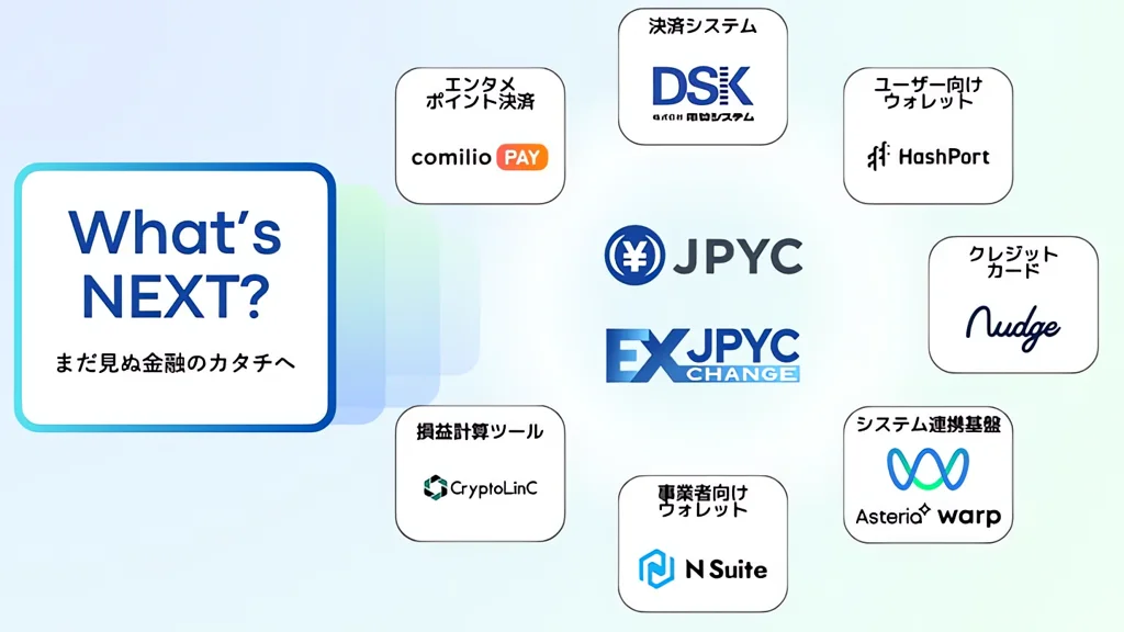 法人資産管理SaaS「N Suite」ではプリセットトークン対応を予定し、業務処理や残高管理の効率化を図る。ナッジのクレジットカード代金JPYC払い、ユーツーテックの漫画家支援プラットフォーム「comilio」での決済導入、クリプトリンクの損益計算ツール「CryptoLinC」での対応も予定されている。