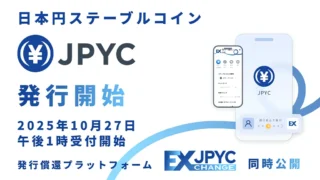 JPYCは10月27日、日本初の日本円建てステーブルコイン「JPYC」の正式発行を開始し、発行・償還を受け付ける公式プラットフォーム「JPYC EX」を公開した。JPYCは資金決済法第2条第5項の電子決済手段に該当し、1:1での日本円交換(発行・償還)、円建て価値を維持した即時送付・受領、ブロックチェーンを用いた低コスト・高速なオンチェーン送金を特長とする。裏付け資産は日本円(預貯金および国債)で、発行残高の100%以上を保全するとしている。