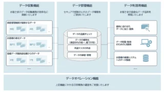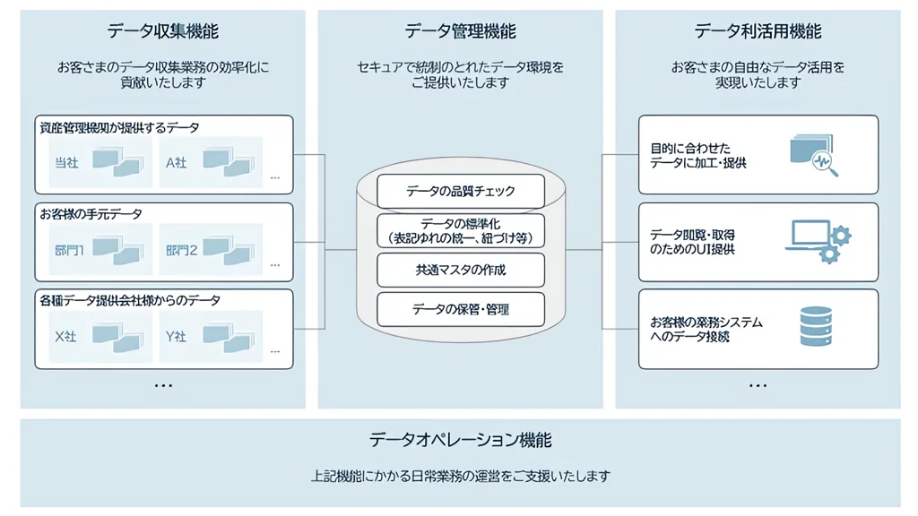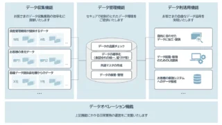 DMSは4つの機能で構成する。第一に、各種データソースとの自動接続等によりデータ収集を効率化する。第二に、異なるデータソースを統合・蓄積するデータウェアハウス機能で、統制の取れたセキュアな環境を提供する。第三に、標準的なユーザーインターフェースや顧客の手元ツールとの接続を通じ、自由なデータ利活用を実現する。第四に、処理状況の確認、データのメンテナンス、クオリティチェックなど、日常業務の運営を支援するデータオペレーション機能を備える。
