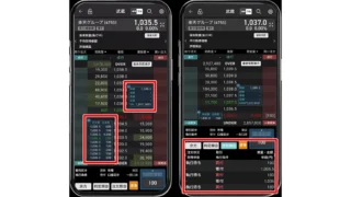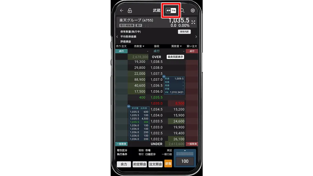 国内株式では、現在値周辺の上下10本に限られていた気配値を、制限値幅まで表示する「フル板」の閲覧も可能になる。通常板との切り替えはワンタップで、ほぼ全注文情報を可視化し、より多くの情報に基づく意思決定を支援する。