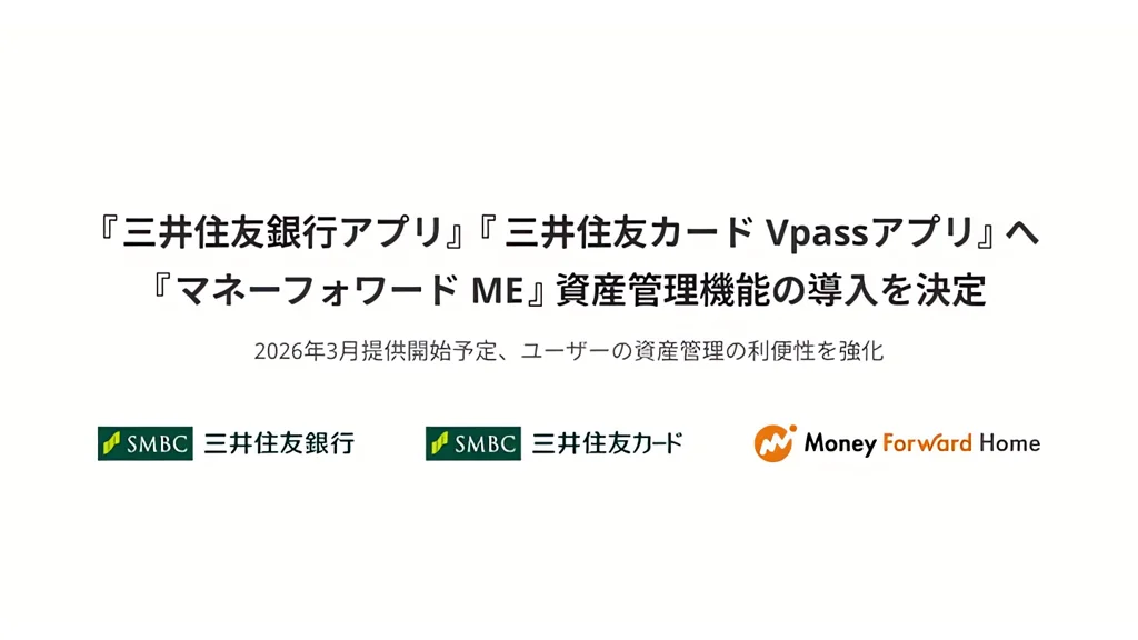 三井住友銀行、三井住友カード、マネーフォワードホームは、2026年3月より『三井住友銀行アプリ』と『三井住友カード Vpassアプリ』に『マネーフォワード ME』の資産管理機能を導入する。両アプリの家計管理機能は終了し、ME連携の新機能へ移行。総資産の一覧表示や残高不足アラートなどを提供し、Vポイントがもらえるキャンペーンも実施する。 三井住友銀行、三井住友カード、マネーフォワードホームは、2026年3月より『三井住友銀行アプリ』および『三井住友カード Vpassアプリ』に『マネーフォワード ME』の資産管理機能を導入することを決定した。導入の背景には、2024年7月に公表されたマネーフォワードと三井住友カードの個人向け事業における資本業務提携の取組がある。