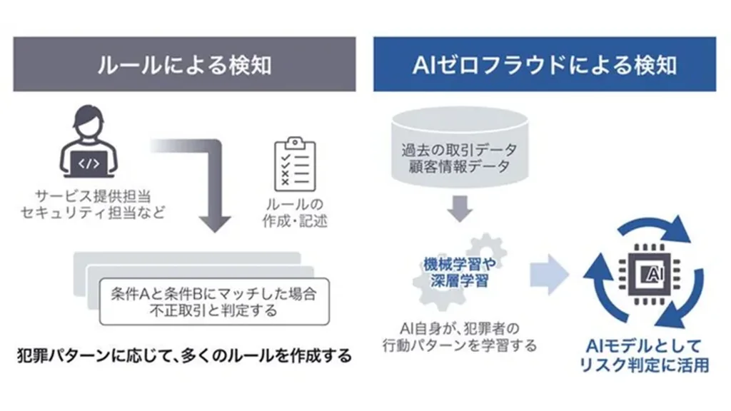 AIゼロフラウドは、金融犯罪対策の専門知見とAI技術を組み合わせ、リアルタイムで不正取引を検知するソリューションだ。従来主流だった固定的なルールに基づく判定では、巧妙化する新たな手口への対応が難しい課題があった。AIゼロフラウドは過去の取引データから不正パターンを学習し、さらに金融犯罪対策センターが収集する最新の犯罪情報を取り込みながら継続的にアップデートすることで、見逃されやすい不正パターンにも対応する。