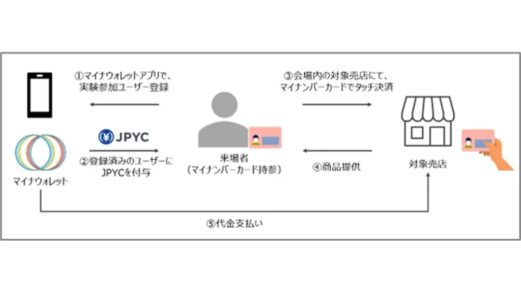 第一弾は福岡市およびライジングゼファーフクオカの協力のもと、1月23日、24日に照葉積水ハウスアリーナで実施する予定だ。決済端末はstera、ユーザー認証はマイナンバーカードとJPKI、決済手段はブロックチェーン上の日本円連動型ステーブルコインJPYCを用いる。来場者はマイナンバーカードで登録後に付与されたJPYCで、売店等で金額を確認しカードをかざして決済する。裏側ではブロックチェーン上で残高移転が行われる。本取り組みは「福岡市実証実験フルサポート事業」に採択されている。