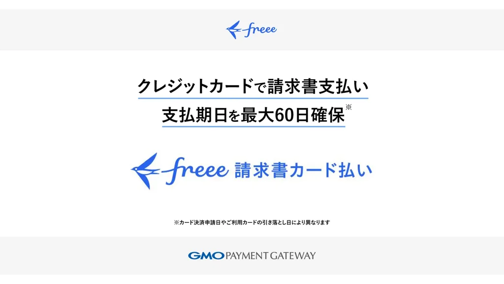 freeeとGMOペイメントゲートウェイ(GMO-PG)は1月30日、請求書支払いをクレジットカードで行える「freee請求書カード払い」の提供を開始した。受領した請求書の支払方法を銀行振込からカード払いに切り替え、引き落とし日まで最大60日を確保しながら支払期日を守れる点を特徴とする。決済後は原則最短即日で請求元口座へ入金され、カード利用は請求元に知られないとしている。