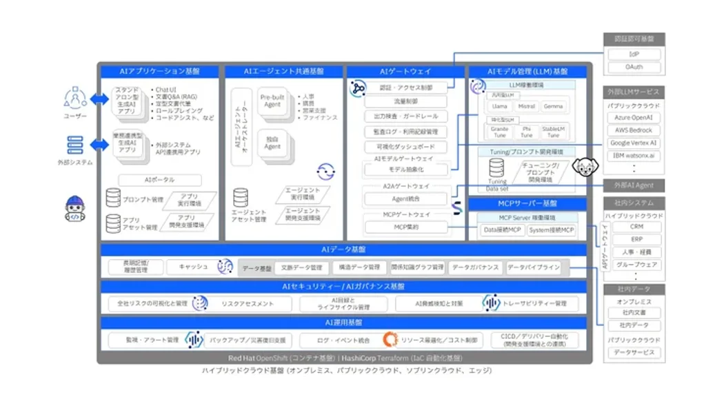 本基盤は「じゅうだん会」のリーダー行として高度なシステム開発・運用を続ける八十二長野銀行の知見をアーキテクチャに反映する。特長は3点で、第一に情報漏えいや不適切回答を防ぐため、金融機関品質の「AIガードレール」を基盤全体に実装する。IBM watsonx.governanceやAIゲートウェイなどを活用し、AIの挙動を可視化・制御してガバナンス体制の実現を目指す。第二にMicrosoft 365上の資料やメールなどの非構造化データと、銀行の構造化データをMicrosoft Fabricを活用したデータ基盤に安全に統合し、既存ツールとの摩擦のない統合を目指す。第三にハイブリッド・バイ・デザインのアプローチにより特定技術への依存を避け、機能を差し替え可能な部品として構成することで、陳腐化やベンダーロックインの回避と最新技術への迅速な移行を狙う。