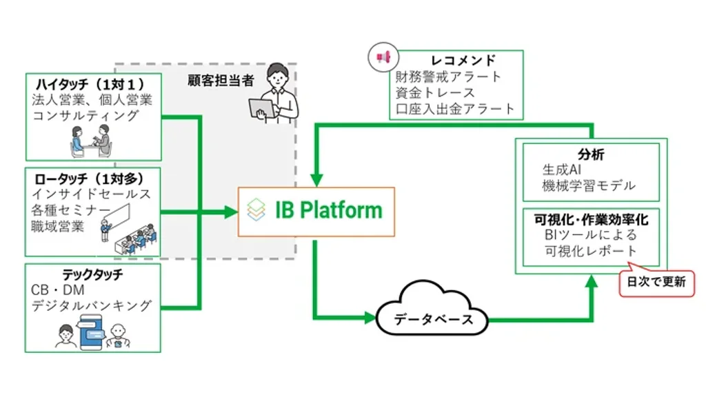 IBPlatformは、CRM、SFA、稟議・決裁、契約、事務処理、コールシステムなど、金融機関の業務を一元管理する統合型ビジネス基盤だ。導入により、システム間で分断されていた業務プロセスの統合や二重入力の解消、部門横断での顧客情報共有、データ活用による提案品質向上といった課題解消を図るとしている。