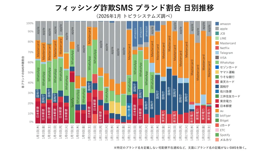 詐欺SMSでは、2025年1月は宅配・デリバリー(69.3%)や金融・決済サービス(22.4%)が中心だったのに対し、2026年1月は「Apple」を含むIT・テクノロジー(25.8%)、「WhatsApp」を含むSNS・コミュニケーション(17.2%)など、幅広い業種・サービスを装う手口が発生したとしている。背景の一つとして、生成AIの進化により多様な文面生成が容易になっている可能性を挙げた。実在企業・ブランドをかたるSMSは、2026年1月に「Apple」をかたるSMSが17日以降に一時減少したものの、25日ごろから再び活発化した。ほかに「日本郵便」「WhatsApp」は上旬、「国税庁」「Mastercard」は下旬に目立ったという。