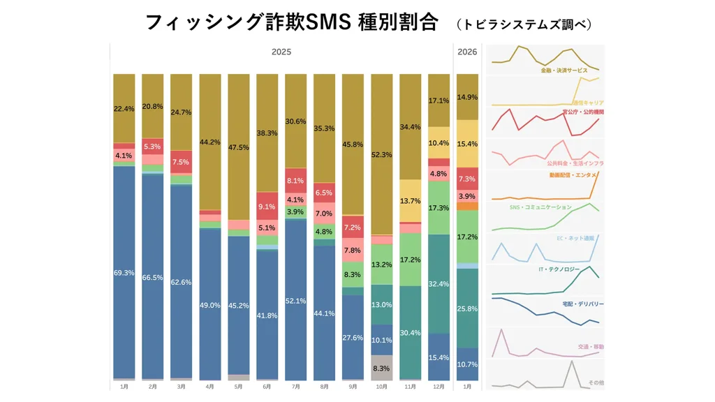 トビラシステムズは2月24日、2026年1月(1月1日〜1月31日)に同社調査で確認した詐欺電話や詐欺SMSの状況をまとめたレポートを公開した。携帯電話番号を使った不審電話が減少する一方で国際電話番号の比率が再び増加した点や、特定の金融機関をかたる自動音声の詐欺電話が増えている点、詐欺SMSが前年同期より多様な業種・サービスを装う傾向が強まった点を主なトピックとして挙げた。あわせて、警察庁の統計として令和7年の特殊詐欺被害が過去最悪となった状況も示した。