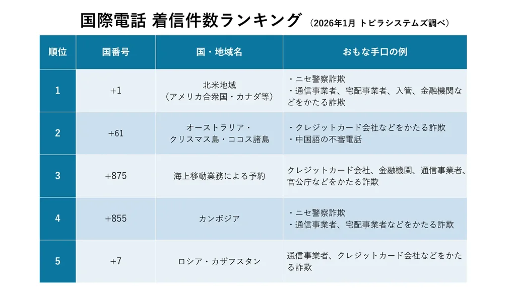 国際電話の着信では、国番号の上位に北米地域、オーストラリア・クリスマス島・ココス諸島、海上移動業務による予約、カンボジア、ロシア・カザフスタンが挙がった。警察官等をかたって捜査名目で金銭をだまし取るニセ警察詐欺は、前月に続き「+1」で始まる北米地域からの発信が多く、「+855」のカンボジアからも多数確認されたという。また、三菱UFJ銀行や三井住友銀行など特定の金融機関をかたり、「出入金記録の確認」「クレジットカードの支払期限切れ」などをうたう自動音声ガイダンスによる詐欺電話の発生も報告した。