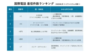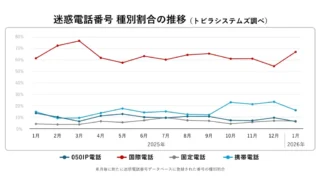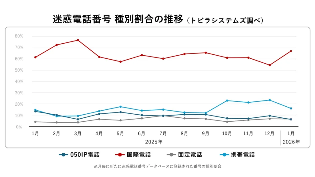 詐欺電話について、2026年1月に新たに同社の迷惑電話番号データベースへ登録された番号の種別割合は、携帯電話番号が16.1%(前月比-7.4%)に低下した。一方、国際電話番号は67.2%(前月比+12.6%)へ増加した。特定IP電話(050番号)や固定電話番号の割合は横ばい傾向としている。