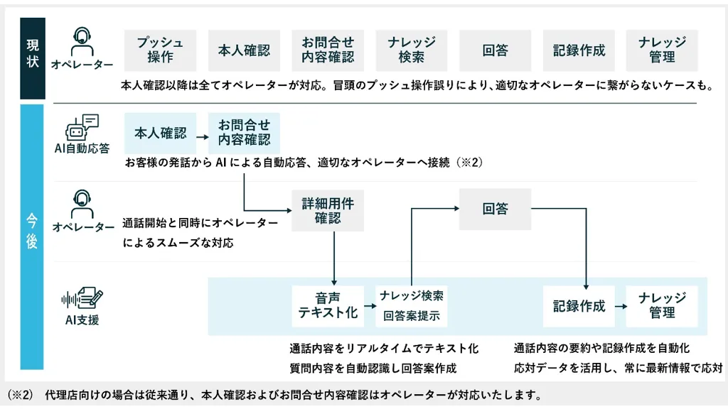 AI導入では、通話内容をリアルタイムでテキスト化し、問合せ内容を自動認識することで、回答案をオペレーターへ迅速に提示する。支援範囲は通話中の応対にとどまらず、終話後の管理業務まで含めて一連の業務プロセスを対象とする。