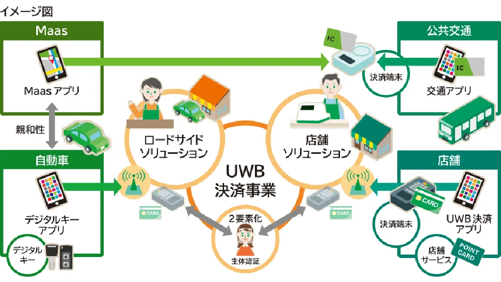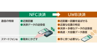UWBは短時間のパルス信号を用い、高精度な位置測位や近距離での高速通信を可能にする無線通信技術だ。NFCのように決済端末へかざす操作や、二次元コード決済のような画面の読み取りを前提とせず、数十メートルの距離があってもデバイスの正確な位置特定や高速通信が可能だという。これに生体認証の活用を組み合わせ、端末から離れていてもスマートフォン等を鞄やポケットに入れたまま支払いができるハンズフリー決済などの実現を目指す。