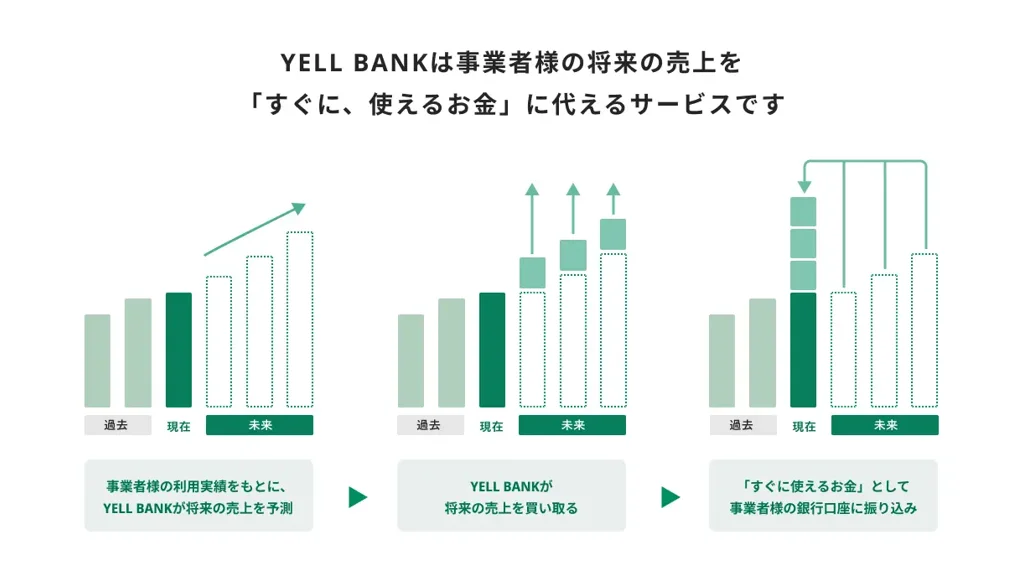 「YELL BANK」は、プラットフォーム連携型の資金調達サービスで、サービス上の売上や利用実績データをもとにAIが将来債権を自動評価し、それを買い取る仕組みを採る。事業者は将来の売上を早期に事業へ活用できるとしており、日常の事業運営の延長線上で資金調達を検討できる点を特徴とする。