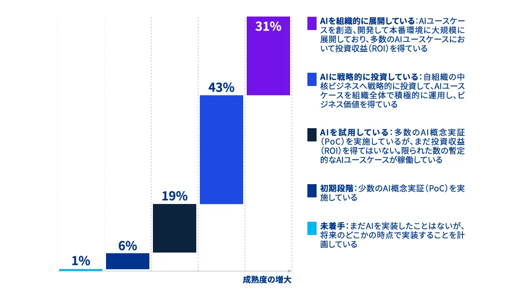 データセキュリティとガバナンスも重要なポイントで、多くの組織がこれを重点領域としている。セキュリティの向上により、より強固なデータ活用の基盤構築が可能とされている。AIの導入も進んでおり、74%の組織がAIで利益を生み出している一方、AIの大規模導入は未だ少数の組織にとどまっている。