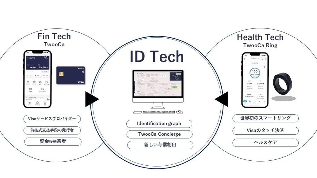 TwooCaは、健康管理と決済を統合した次世代型プラットフォームであり、Visaタッチ決済に対応した健康管理機能付きリング型ウェアラブルデバイス「TwooCa Ring」も提供される。健康状態の可視化に加え、AIコンシェルジュによる健康改善提案と活動に応じた電子マネーの付与を通じて、日常の行動が楽しく続けられる体験を提供する。