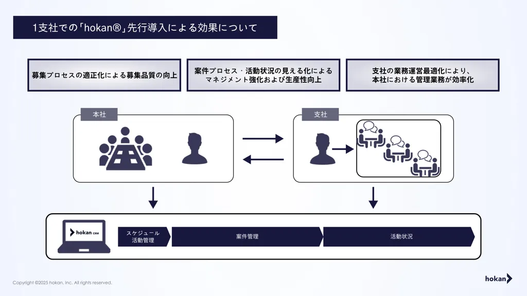 オリックス生命では、これまで自社開発のシステムを活用していたが、案件管理や活動状況の確認に複数のツールを併用する必要があり、非効率性が課題となっていた。これを解決するため、2024年4月より新たなシステム導入を検討し、同年8月から2025年1月にかけて1支社で「hokan」を先行導入。その結果、運用の有効性が確認され、全支社での本格展開が決定した。