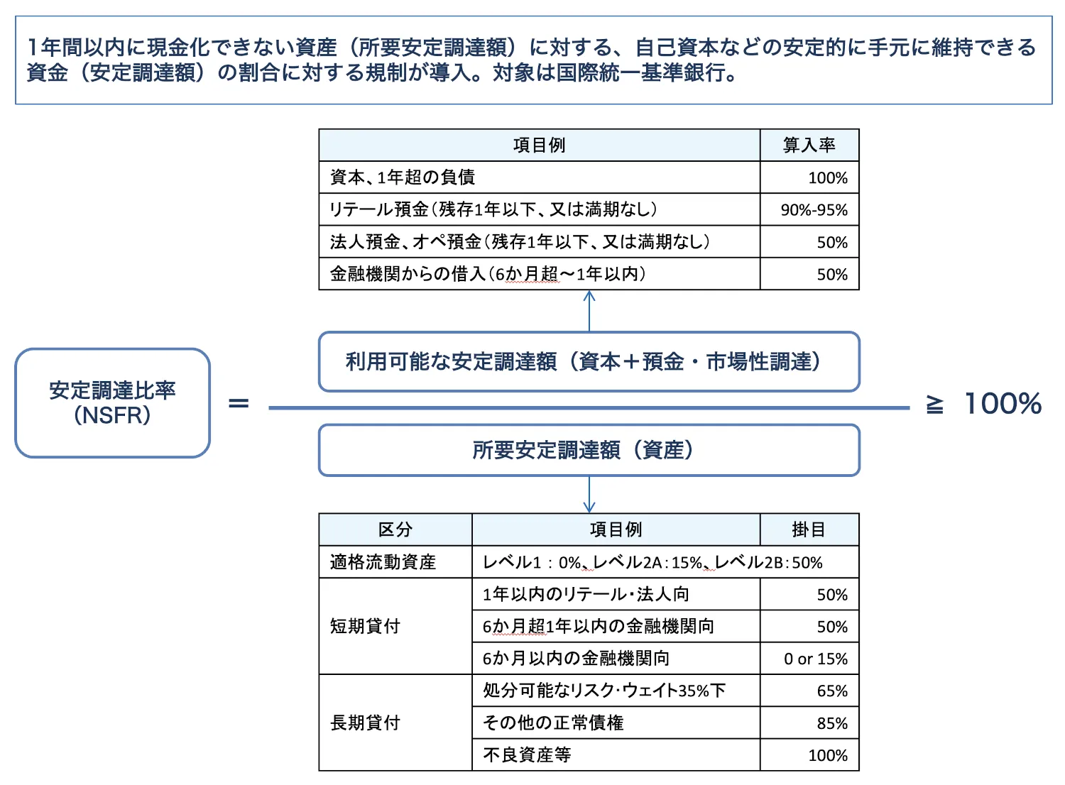 具体的には、自己資本を「Tier1(内部留保や普通株式、優先株式など)」と「Tier2(期限付の劣後債、一般貸倒引当金など)」に分類し、破綻した場合の損失吸収力を高めることが重視されました。また、レバレッジ比率や安定調達比率などの指標を導入することで、過度なレバレッジをかけた資産運用の抑制や、急な資金の引き出し需要に対する対応力の強化を図っています。